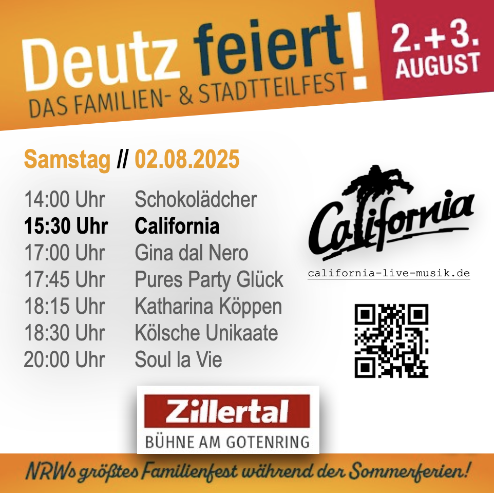Die Band California freut sich, am Samstag von 15:30 - 17:00 Uhr auf der Zillertal-Bühne am Gotenring wieder dabei sein zu dürfen und möchte das Publikum mit Rock- und Pop-Klassikern der 80er- und 90er Jahre begeistern. Lasst uns den Nachmittag gemeinsam rocken - es ist für jeden etwas dabei.