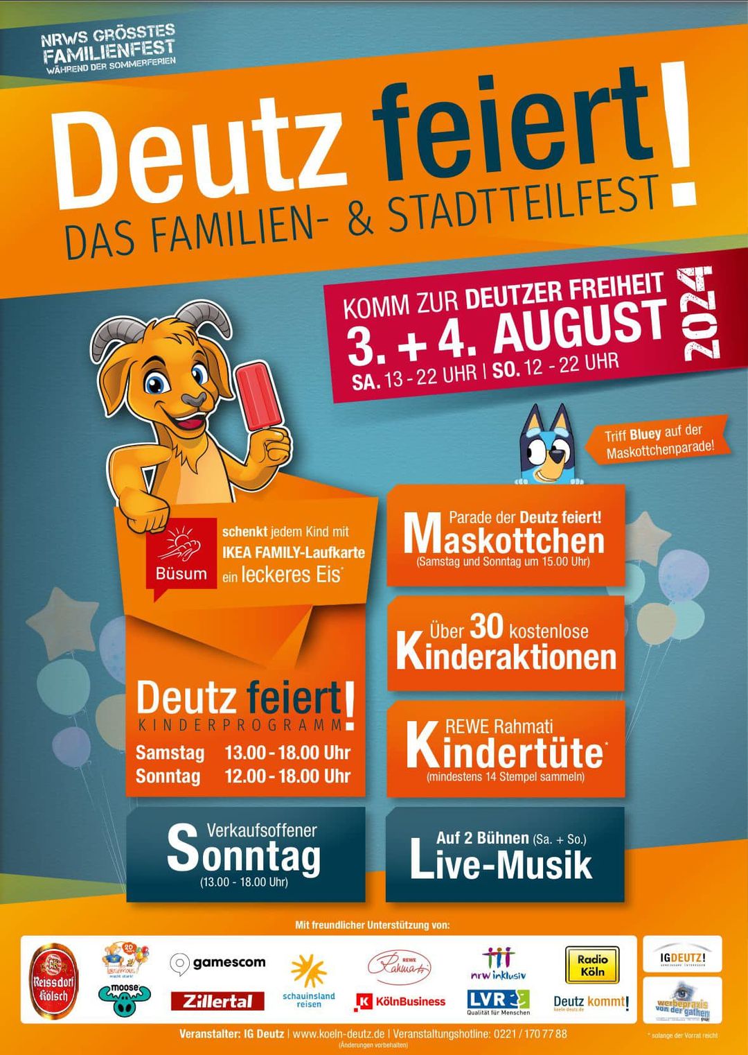 “Deutz feiert!” - das größte Familien- und Stadtteilfest in NRW während der Sommerferien. Am Samstag, den 3. August 2024 ist es wieder soweit: Auf der Festmeile der Deutzer Freiheit und den angrenzenden Nebenstraßen wird Spaß, Unterhaltung und Entertainment für Klein und Groß geboten.
